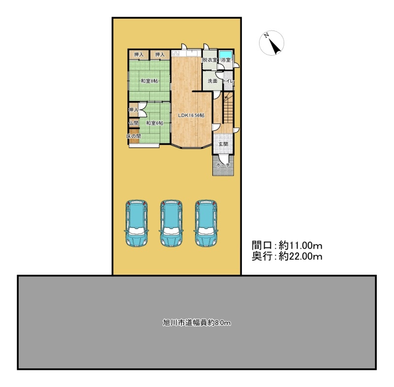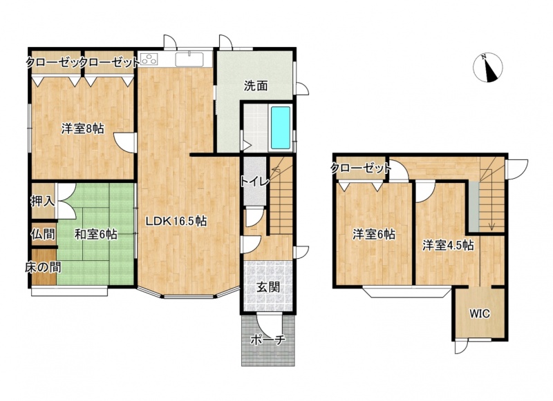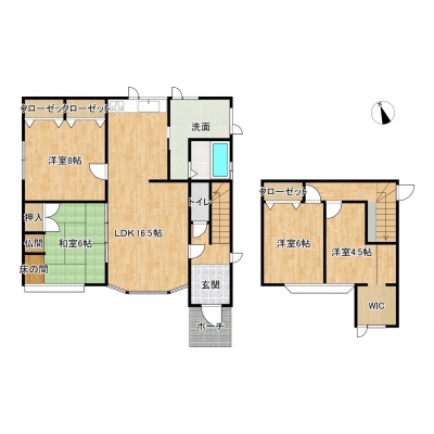 | 間取り | 4LDK1階:LDK16.5帖 洋室8帖 和室6帖 / 2階:洋室6帖 洋室4.5帖 |