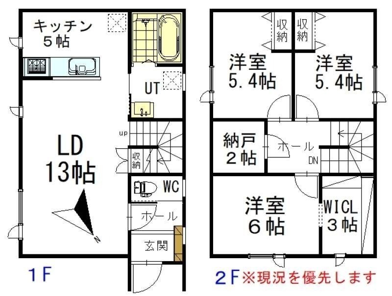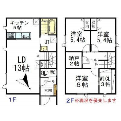 | 間取り | 3SLDK1階:LD13帖 K5帖 / 2階:洋室6帖 洋室5.4帖 洋室5.4帖 S2帖 |
