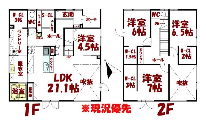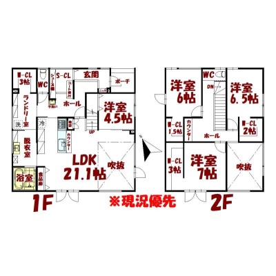 | 間取り | 4LDK1階:LDK21.1帖 洋室4.5帖 / 2階:洋室7帖 洋室6.5帖 洋室6帖 |