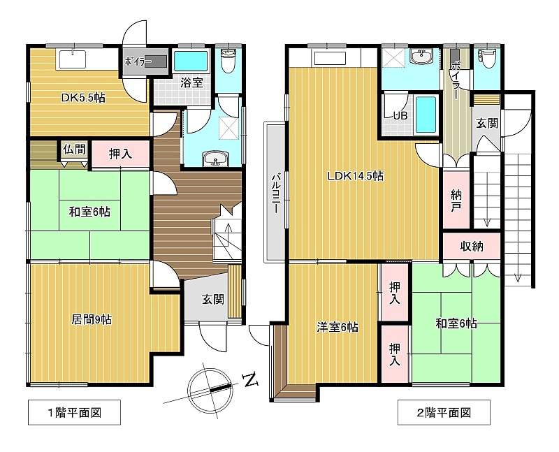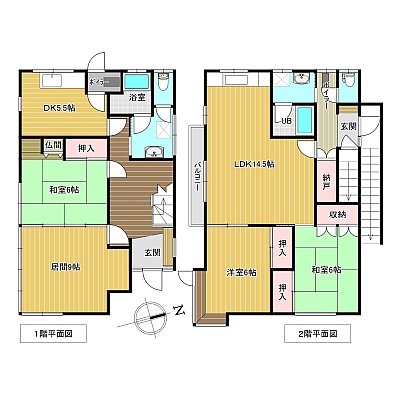 | 間取り | 二世帯型1階:L9帖 和室6帖 DK5.5帖 / 2階:LDK14.5帖 洋室6帖 和室6帖 |