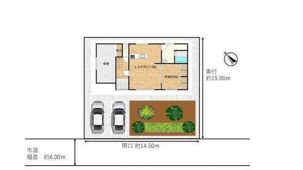 【敷地図】一方道路に接道しており駐車スペースは車庫含めて3台