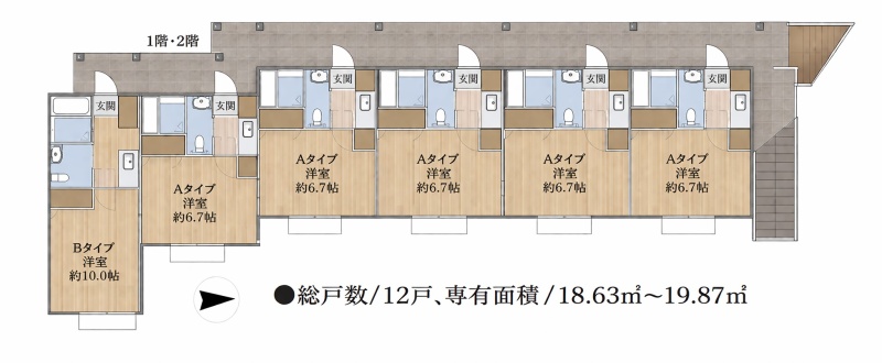 建物の階建 地上2階建 間取り 1K×12戸 駐車場 なし接道状況 一方 都市計画区域 市街化区域 用途地域 - 第1種住居地域(建ぺい率:60% / 容積率:200%)