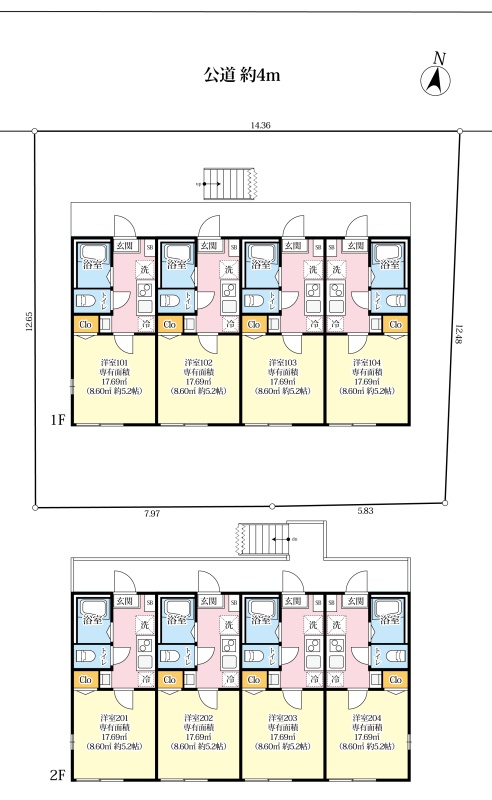 建物の階建 地上2階建 間取り 1K×8戸 駐車場 なし接道状況 一方 - 北側幅4.00mの公道に14.30m接道