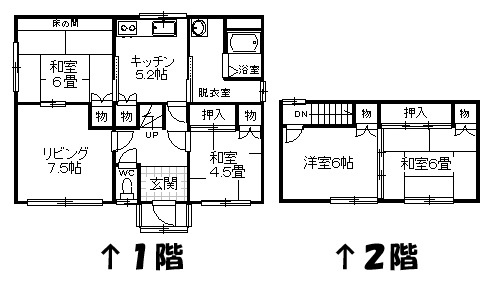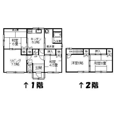 | 間取り | 4LDK1階:L7.5帖 K5.2帖 和室6帖 和室4.5帖 / 2階:洋室6帖 和室6帖 |