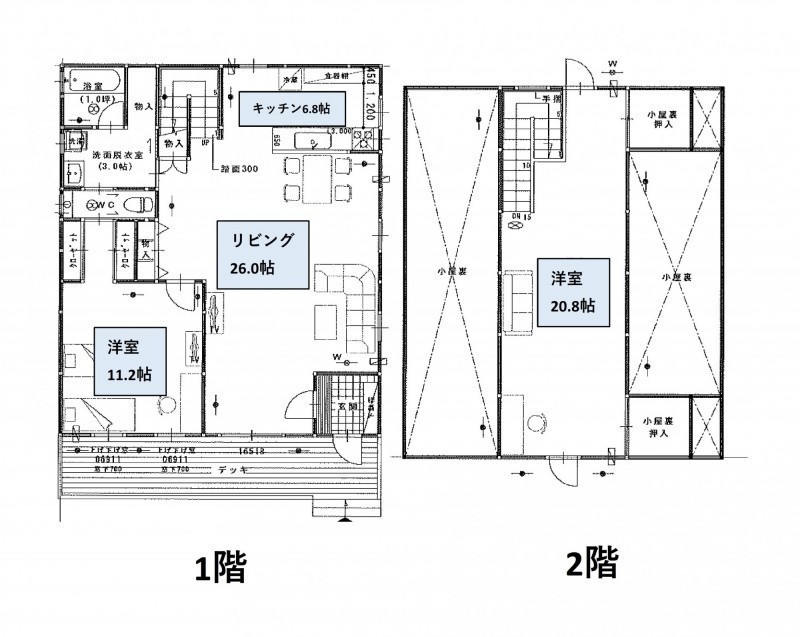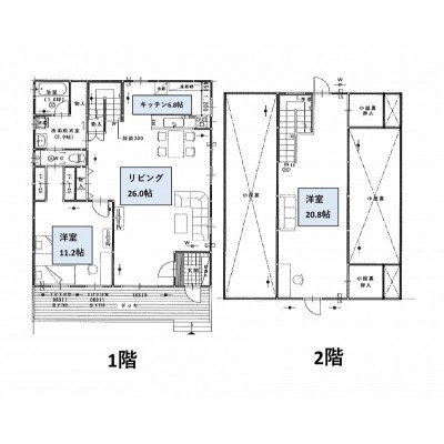 | 間取り | 2LDK1階:LDK26帖 洋室11.25帖 / 2階:洋室20.83帖 |