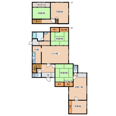 | 間取り | 6LDK1階:LD12帖 K4帖 和室8帖 和室6帖 洋室11帖 洋室6帖 / 2階:和室5帖 洋室8帖 |