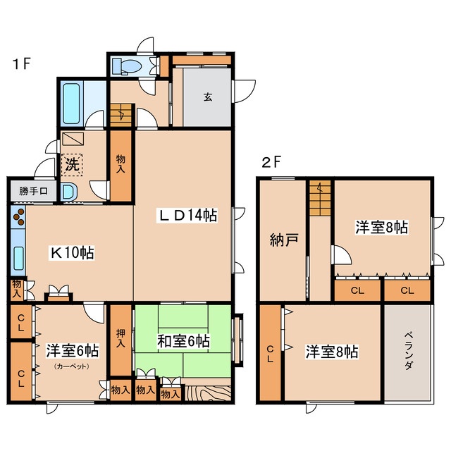 | 間取り | 4LDK1階:LD14帖 K10帖 和室6帖 洋室6帖 / 2階:洋室8帖 洋室8帖 |