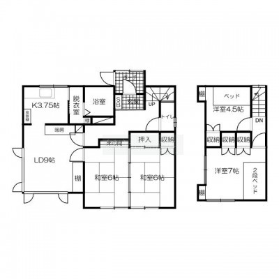 建物の階建 地上2階建 構造 木造 間取り 4LDKLD9.0帖 K3.7帖 和室6.0帖×2 洋室7.0帖 洋室4.5帖 駐車場 あり接道状況 角地 - 西側幅6.00mの公道に11.60m接道