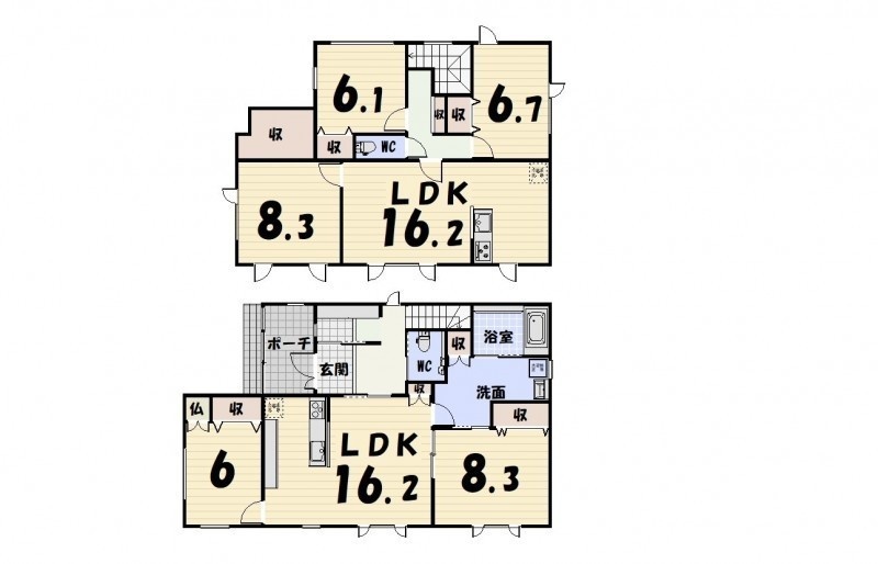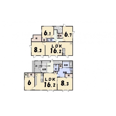 | 間取り | 二世帯型1階:LDK10帖 洋室6帖 その他8.3帖 / 2階:LD10帖 K6.2帖 その他8.3帖 洋室6.1帖 洋室6.7帖 |