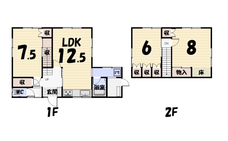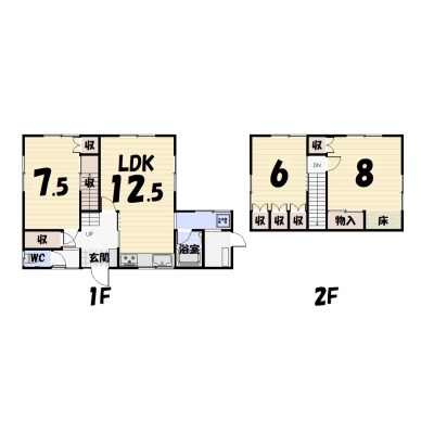 | 間取り | 3LDK1階:LDK12.5帖 洋室7.5帖 / 2階:洋室6帖 洋室8帖 |
