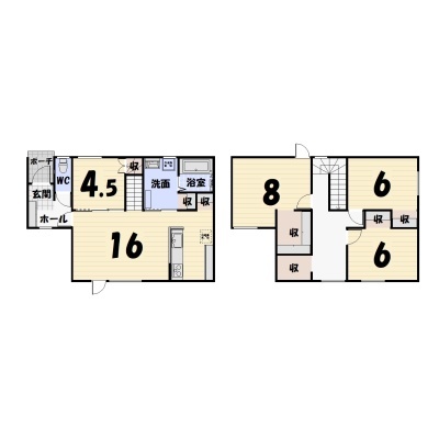 | 間取り | 4LDK1階:LDK16帖 洋室4.5帖 / 2階:洋室8帖 洋室6帖 洋室6帖 |