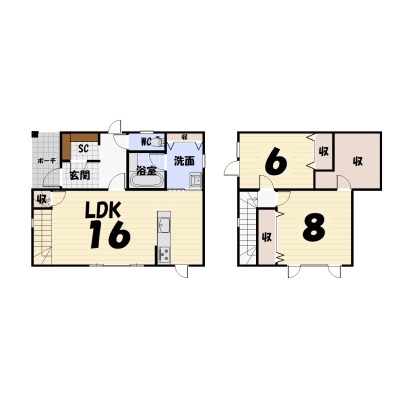 | 間取り | 2LDK1階:LDK16帖 / 2階:洋室6帖 洋室8帖 |