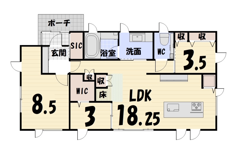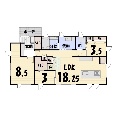 | 間取り | 3LDK1階:LDK18.2帖 洋室8.5帖 洋室3帖 洋室3.5帖 |