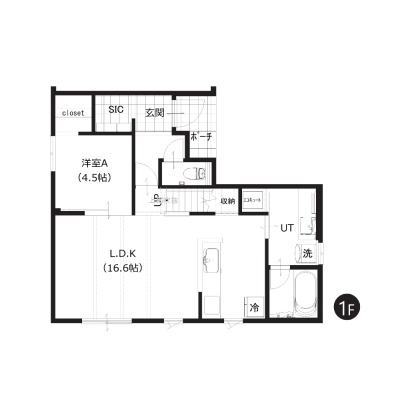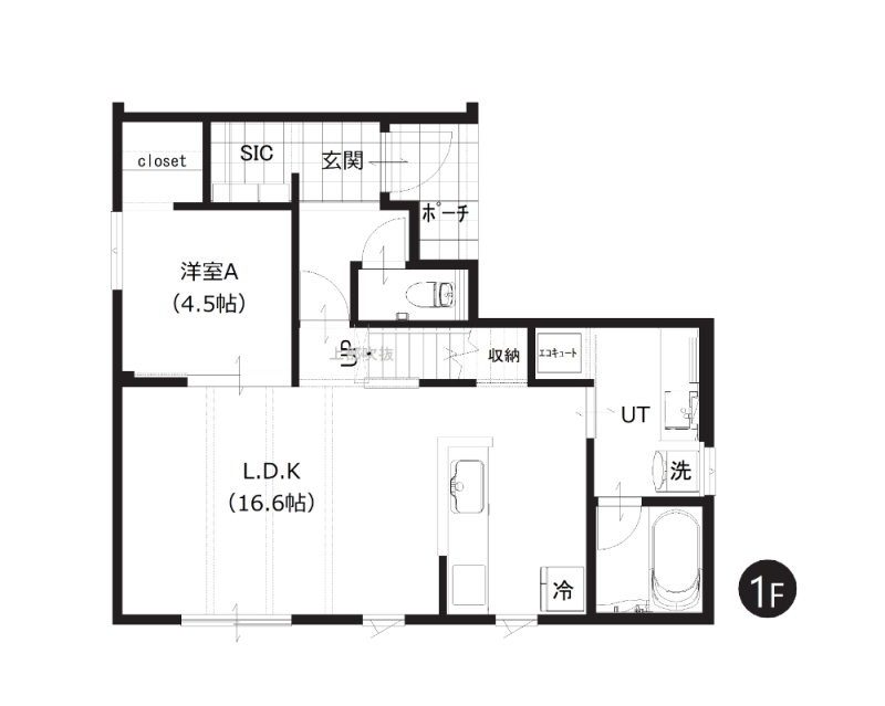 【1階間取図】1階にLDKと水回りを集約させた使い勝手の良い間取り。