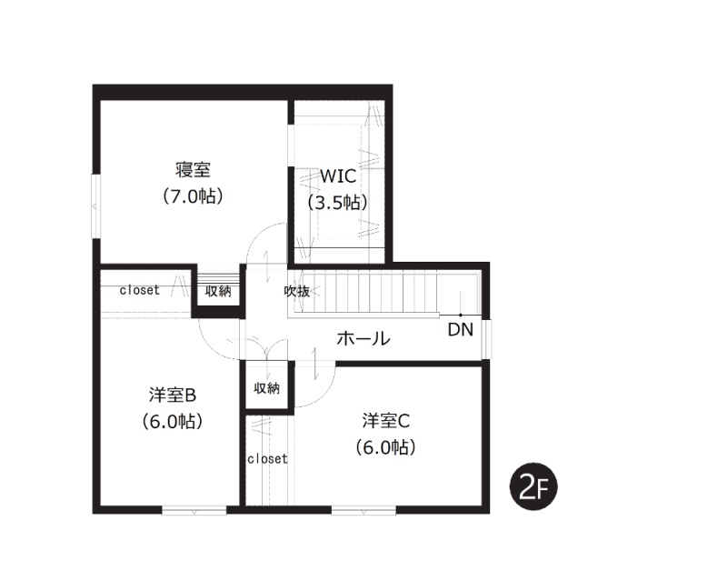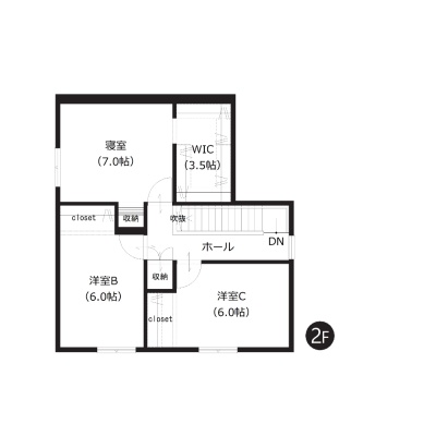 【2階間取図】2階の全洋室は6帖以上のゆとりある広さ。