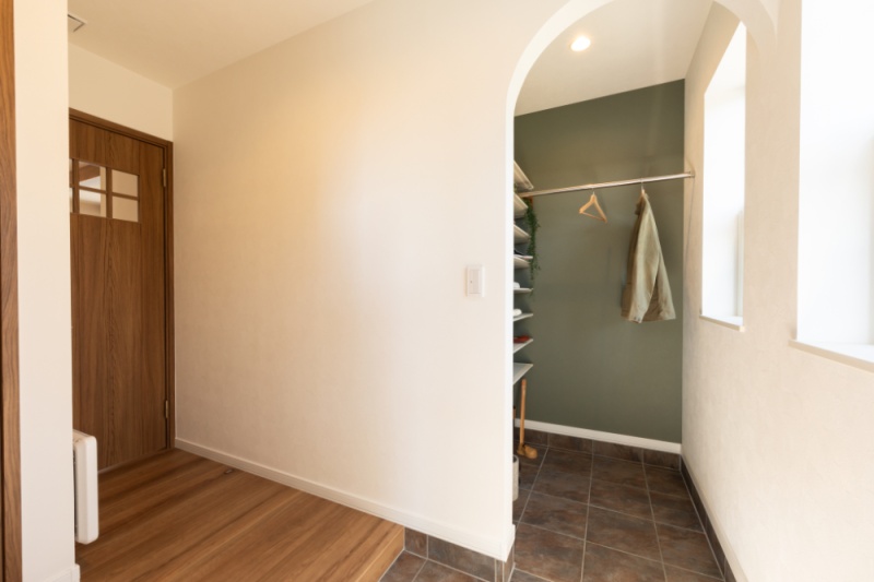 【玄関】 シューズクロークにはステンパイプを設け、濡れた上着もそのまま掛けられる便利な設計。 (2025年10月撮影)
