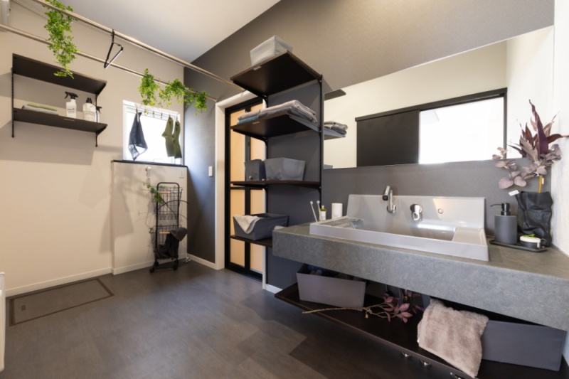 【ユーティリティ】幅1.2mの造作風洗面台を設け、落ち着いたグレー色の洗面ボウルでシックな印象に。(2026年1月撮影)