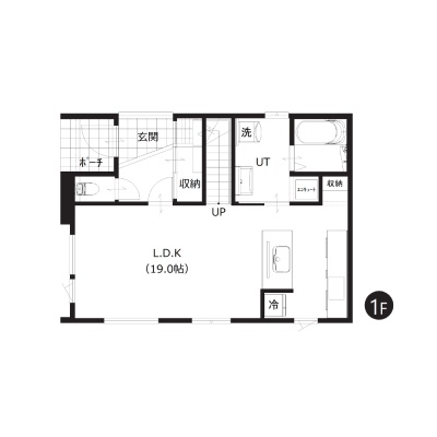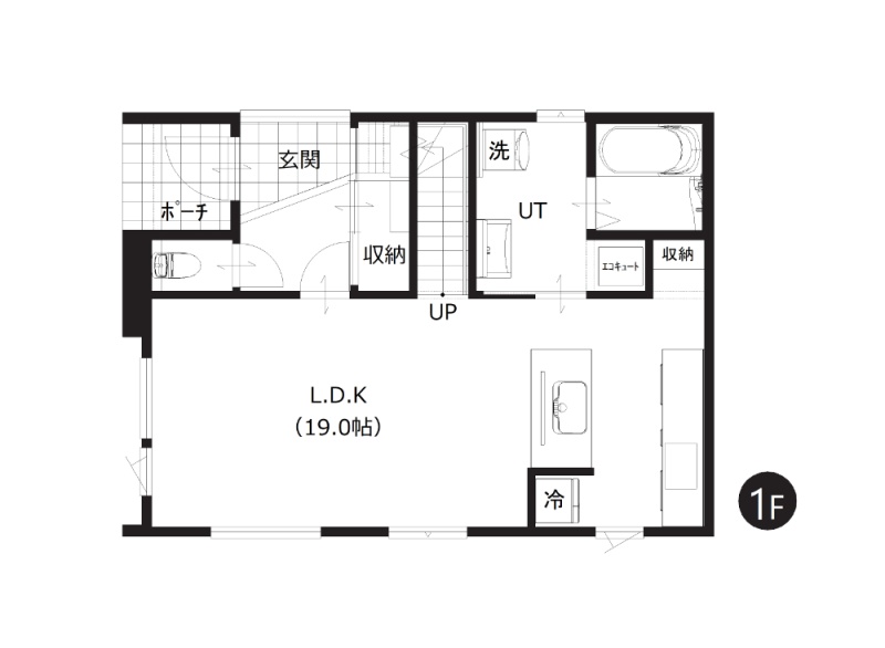 【1階間取図】 約19帖のLDKは対面キッチンとリビング階段を採用しています。