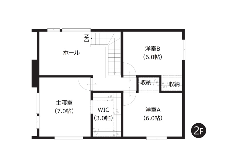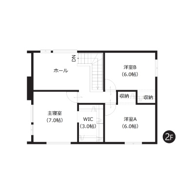 【2階間取図】 全居室6帖以上のゆとり設計。約3帖のWICを含む全居室収納付きです。