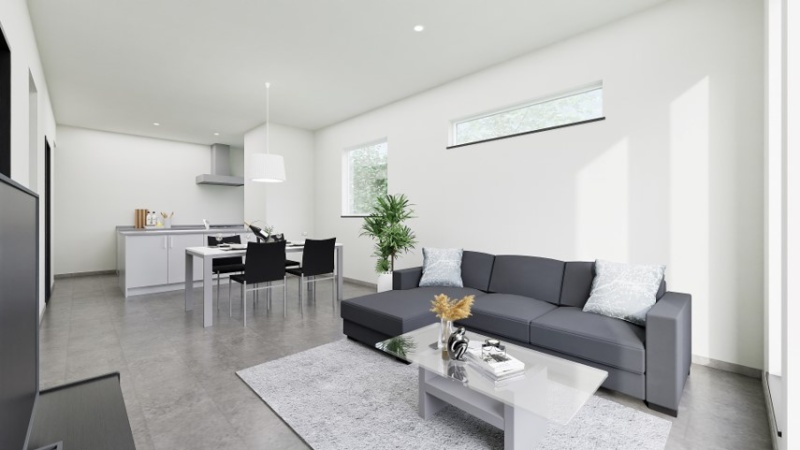 【完成予想図】 1階の天井は通常より30cm高いハイスタッド仕様。開放感と広がりを感じられ、自然光を多く取り込めます。