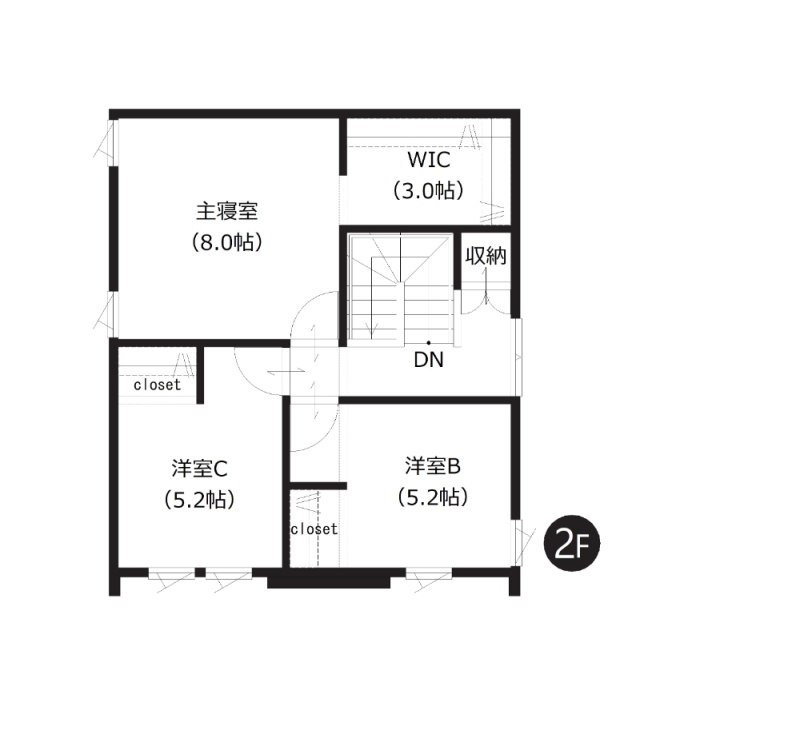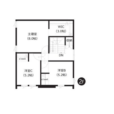 【2階間取図】 主寝室はゆったり約8帖、ベッドを置いてもゆとりがございますね。うれしいWIC付きです。