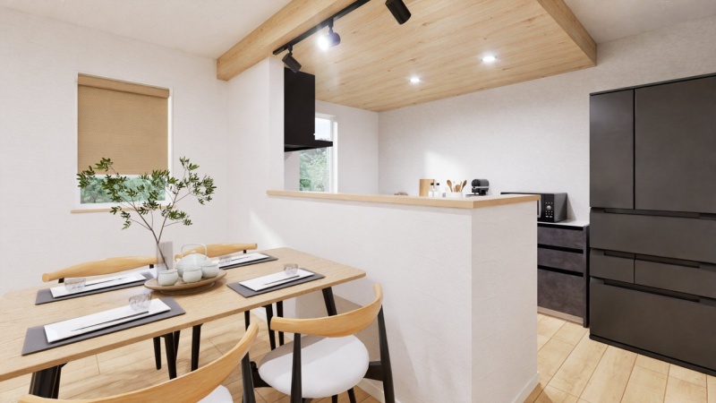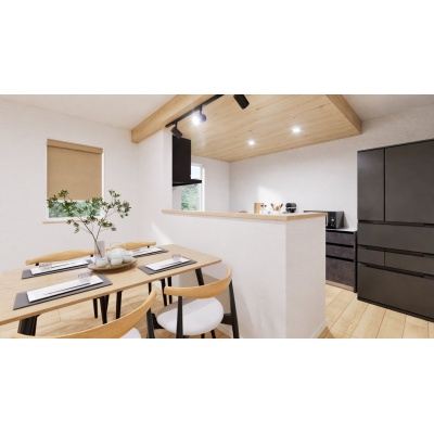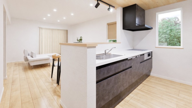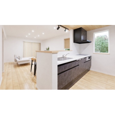 【完成予想図】 お料理をしながらリビングが見渡せる対面キッチンを採用。お子様を見守りながら家事ができます。