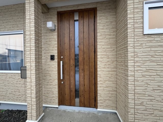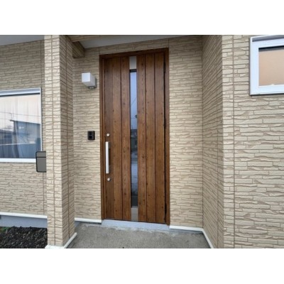 光を採り込むスリット窓付き。木目調が映えるお洒落な玄関ドア♪