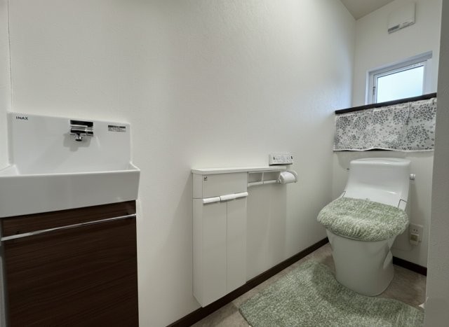 手洗い器付きで衛生的。白を基調とした清潔感あふれるトイレ。