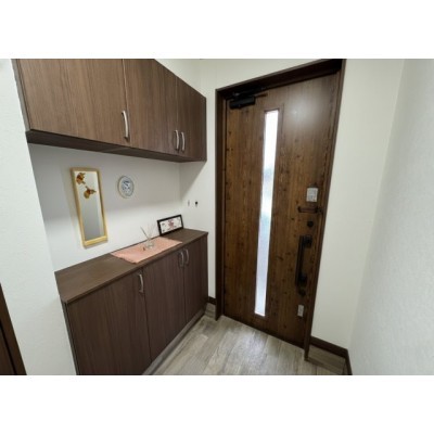 上下に分かれた大容量収納。木目で統一された落ち着く玄関。