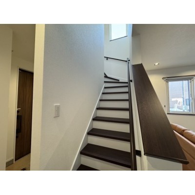 リビング横の階段で家族の気配を感じる、安心感のある間取り。