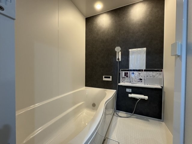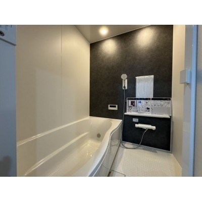 シックな壁が魅力!足を伸ばせる最新ユニットバス