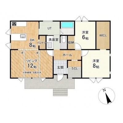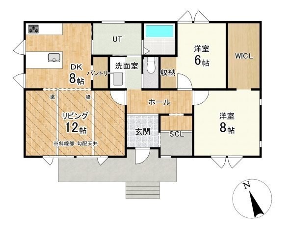 勾配天井と化粧梁が美しい開放的な空間