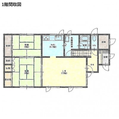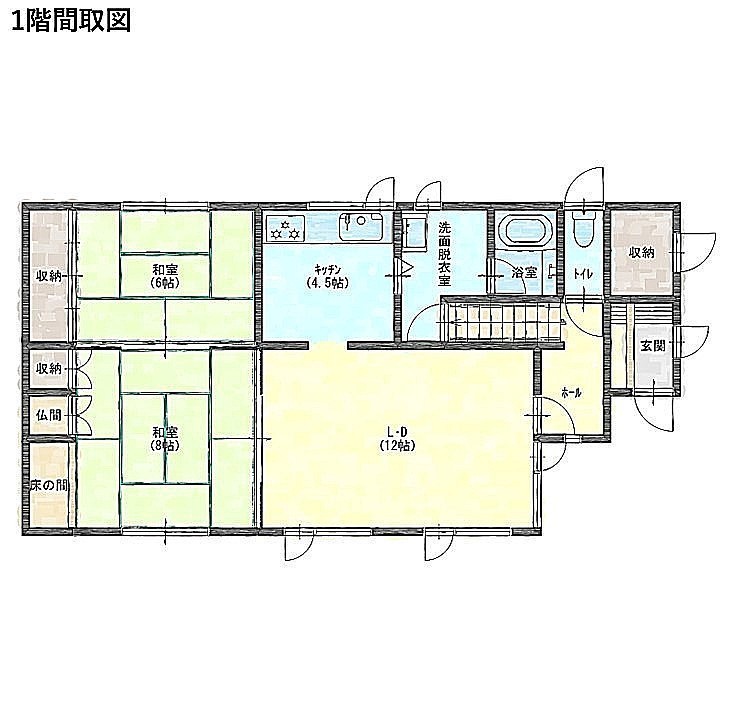 | 間取り | 4LDK1階:LD12帖 K4.5帖 和室8帖 和室6帖 / 2階:洋室6帖 洋室8帖 |