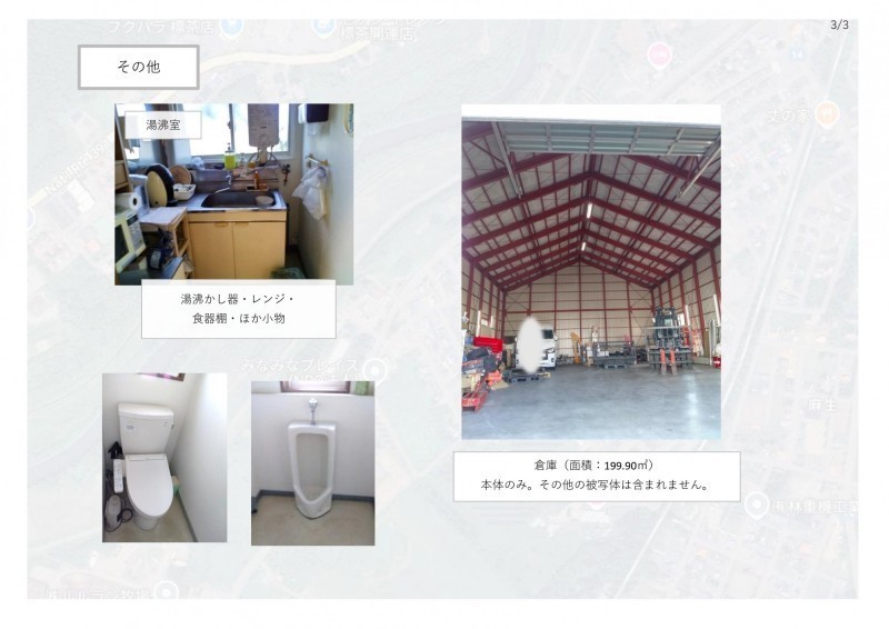 備考 ・付帯設備あり・売主の契約不適合責任免責・現状有姿での引渡し・倉庫面積199.9㎡ 主な周辺施設色がついているアイコンをクリックすると、本物件までの道順を見ることができます。