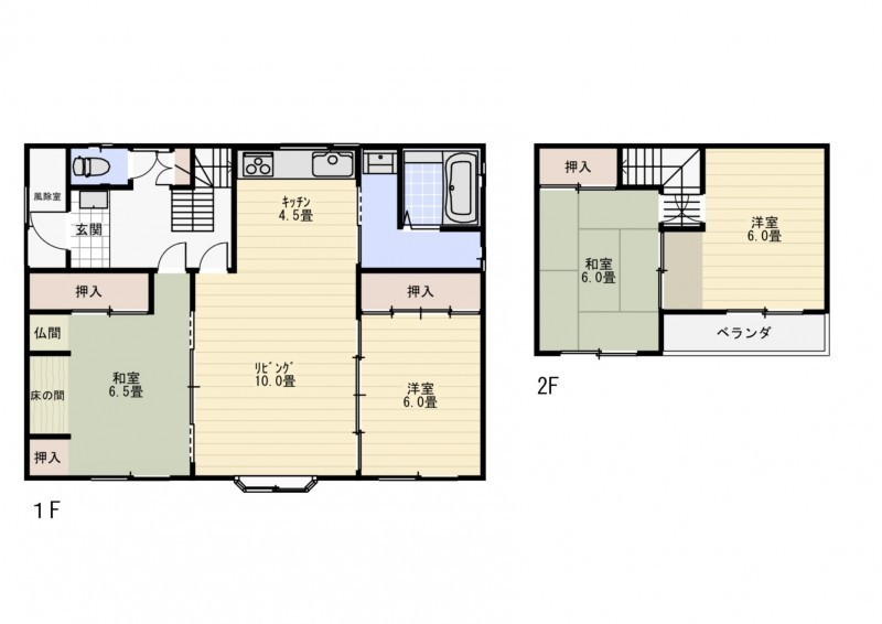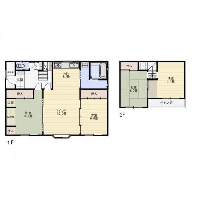 | 間取り | 4LDK1階:L10帖 DK4.5帖 和室6.5帖 洋室6帖 / 2階:和室6帖 洋室6帖 |