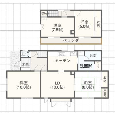 | 間取り | 4LDK1階:LD10帖 K6.8帖 洋室10帖 和室8帖 / 2階:洋室7.5帖 洋室6帖 |