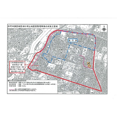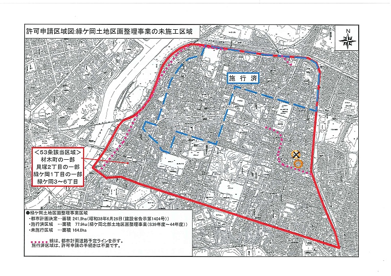 都市計画法53条許可申請地域。材木町一部、貝塚2丁目一部、緑ケ岡1丁目一部、緑ケ岡3~6丁目。他愛国1~3丁目。