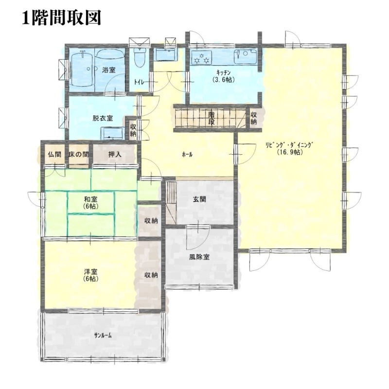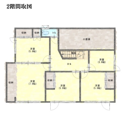 | 間取り | 7DK以上1階:LD16.9帖 K3.6帖 和室6帖 洋室6帖 / 2階:洋室5.8帖 洋室7.9帖 洋室5.8帖 洋室5.8帖 洋室3.6帖 |