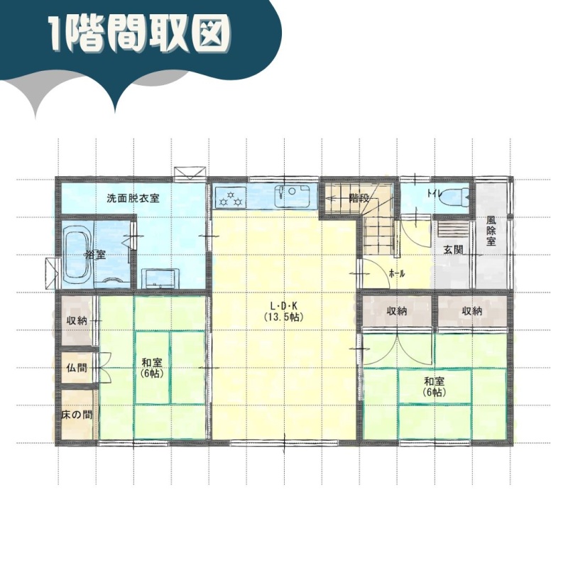 | 間取り | 4LDK1階:LDK13.5帖 和室6帖 和室6帖 / 2階:和室6帖 洋室8帖 |