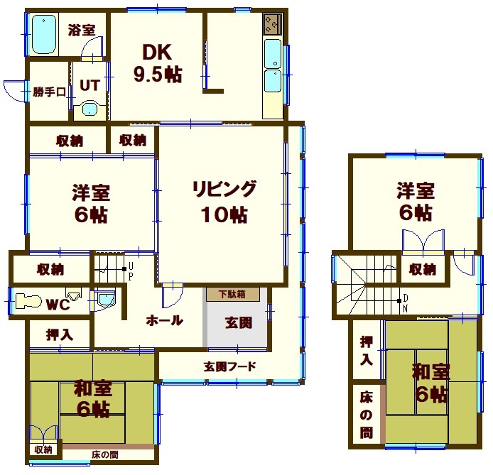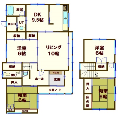 | 間取り | 4LDK1階:L10帖 DK9.5帖 洋室6帖 和室6帖 / 2階:洋室6帖 和室6帖 |