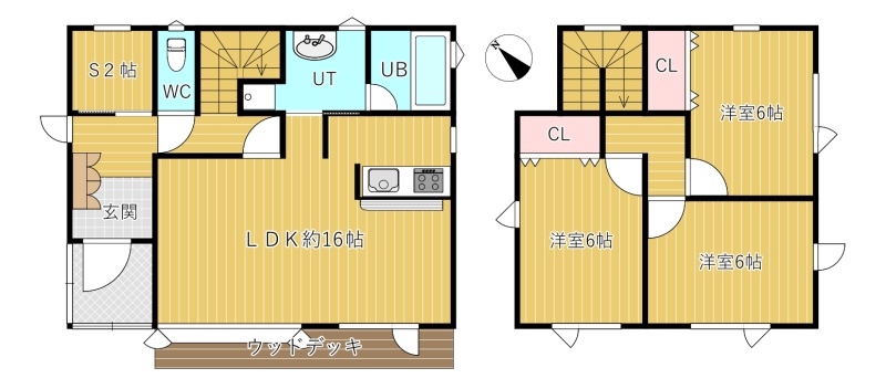 | 間取り | 3SLDK1階:LDK16帖 S2帖 / 2階:洋室6帖 洋室6帖 洋室6帖 |