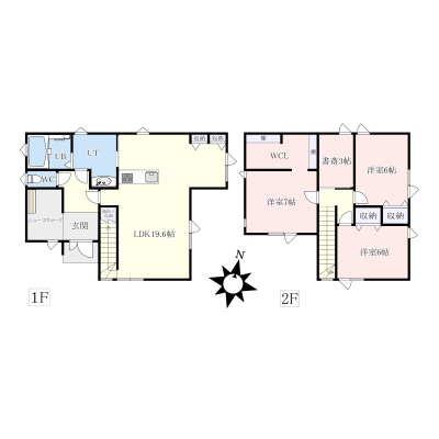 | 間取り | 3SLDK1階:LDK19.6帖 / 2階:洋室7帖 洋室6帖 洋室6帖 |