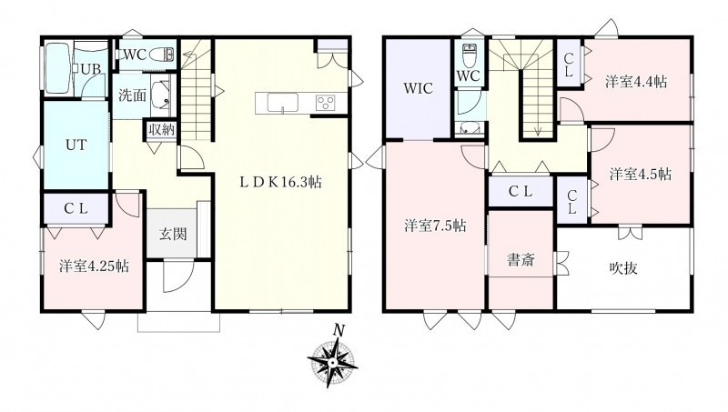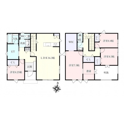 | 間取り | 4SLDK1階:LDK16.3帖 洋室4.2帖 / 2階:洋室7.5帖 その他3帖 洋室4.5帖 洋室4.4帖 |