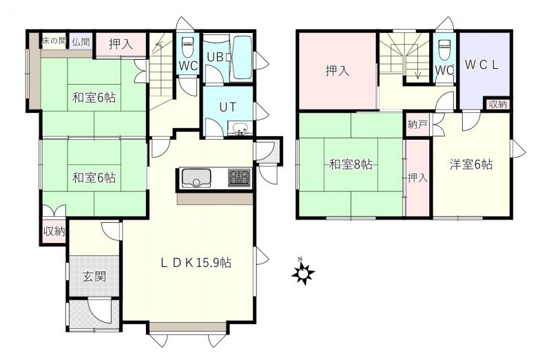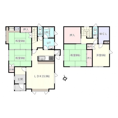 | 間取り | 4LDK1階:LDK16帖 和室6帖 和室6帖 / 2階:和室8帖 洋室6帖 |