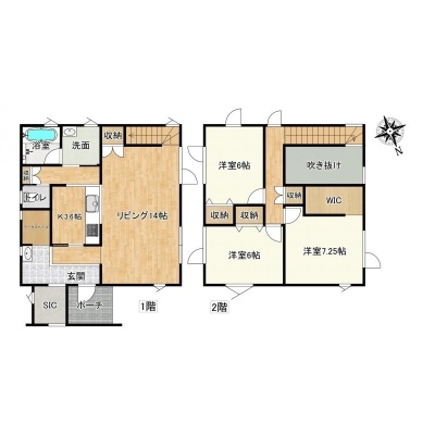 | 間取り | 3LDK1階:LD14帖 K3.6帖 / 2階:洋室7.25帖 洋室6帖 洋室6帖 |