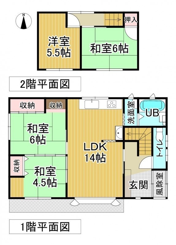| 間取り | 4LDK1階:LDK14帖 和室6帖 和室4.5帖 / 2階:和室6帖 洋室5.5帖 |