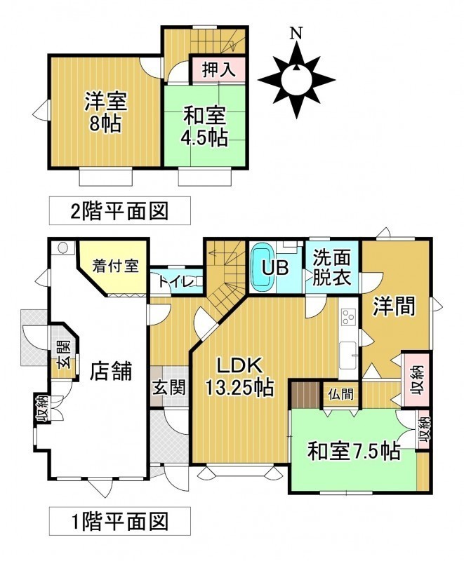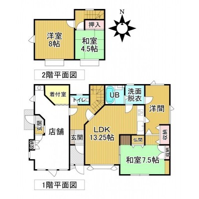 | 間取り | その他1階:LDK13.25帖 和室7.5帖 洋室6帖 その他15.75帖 / 2階:和室4.5帖 洋室8帖 |