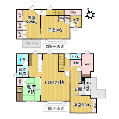 | 間取り | 4SLDK2階:洋室9帖 S2帖 / その他:LDK21帖 和室6帖 洋室5.8帖 洋室5.25帖 |