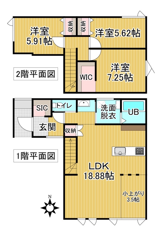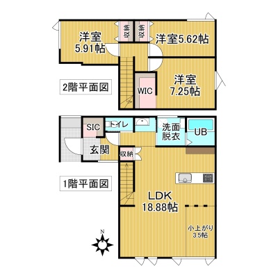 | 間取り | 3LDK1階:LDK18.88帖 / 2階:洋室7.25帖 洋室5.62帖 洋室5.91帖 |