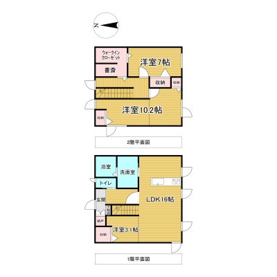 | 間取り | 3LDK1階:LDK16帖 洋室3.1帖 / 2階:洋室10.2帖 洋室7帖 |
